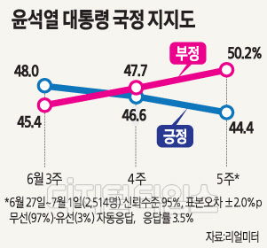여론조사 전문업체 리얼미터가 4일 공개한 여론조사(조사기간 6월27일~7월1일, 표본오차는 95% 신뢰수준에서 ±2.0%포인트, 중앙선거여론조사심의위원회의 홈페이지 참조) 결과를 보면 윤 대통령이 '국정 수행을 잘하고 있다'는 긍정평가는 44.4%, '국정 수행을 잘못하고 있다'는 부정평가는 50.2%로 집계됐다. 2주 연속 부정평가가 앞서는 '데드 크로스'를 보였다. 특히 지난 조사(6월 4주째)보다 긍정평가는 2.2%포인트 줄었고, 부정 평가는 2.5%포인트 늘었다. 긍정평가와 부정평가 간 차이는 5.8%포인트로 오차범위를 벗어났다. 윤 대통령의 국정수행 평가에서 부정평가가 오차범위 밖에서 긍정평가를 앞선 것은 이번이 처음이다.