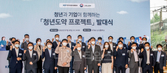 20일 서울 성동구 KT&G 상상플래닛에서 열린 청년과 기업이 함께하는 '청년도약 프로젝트' 발대식에서 손경식 한국경영자총협회 회장과 권기섭 고용노동부 차관 등 참석자들이 기념 촬영을 하고 있다.