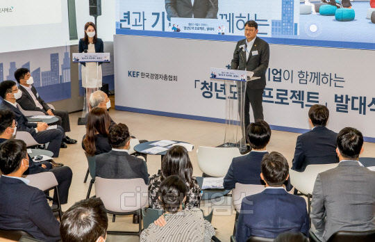 권기섭 고용노동부 차관이 20일 서울 성동구 KT&G 상상플래닛에서 열린 청년과 기업이 함께하는 '청년도약 프로젝트' 발대식에서 인사말을 하고 있다.