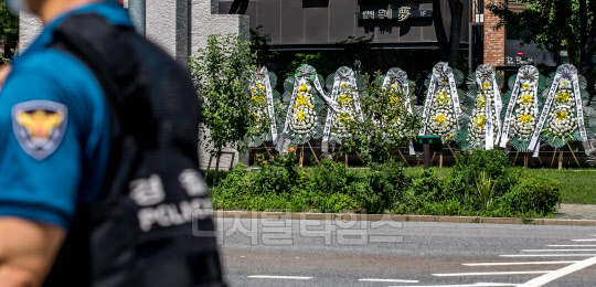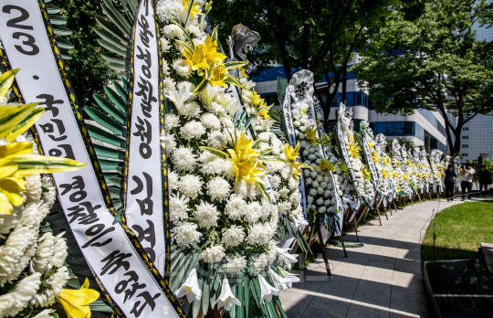 행안부의 경찰국 신설을 둘러싼 경찰 내부 반발이 확산하고 있는 25일 서울 서대문구 경찰청 인근에 경찰국 신설을 반대하는 근조 화환이 세워져 있다.