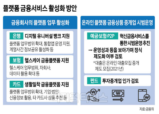 은행앱 하나로 은행은 물론 보험·카드·증권 등 다양한 금융서비스와 비금융서비스까지 이용할 수 있는 '디지털 유니버설 뱅크' 시대가 열린다. 또 플랫폼 업체들은 기존에 허용됐던 대출상품 비교 서비스에 이어 예·적금과 보험 상품도 비교·추천할 수 있게 된다. 금융위원회는 23일 '금융규제혁신회의' 2차 회의를 열고 이같은 내용을 골자로 하는 '금융회사의 플랫폼 금융 활성화 및 온라인 플랫폼 금융상품 중개업 시범운영 방안'과 '규제 샌드박스 내실화 방안'을 심의했다. 이날 심의된 내용은 하반기 중 단계적으로 시행된다. 금융위가 규제혁신을 위해 구성한 회의체의 첫 안건으로 플랫폼 활성화를 들고 나온 것은 오프라인 중심의 규제를 개선하는 것이 무엇보다 시급하다는 판단에서 비롯됐다.