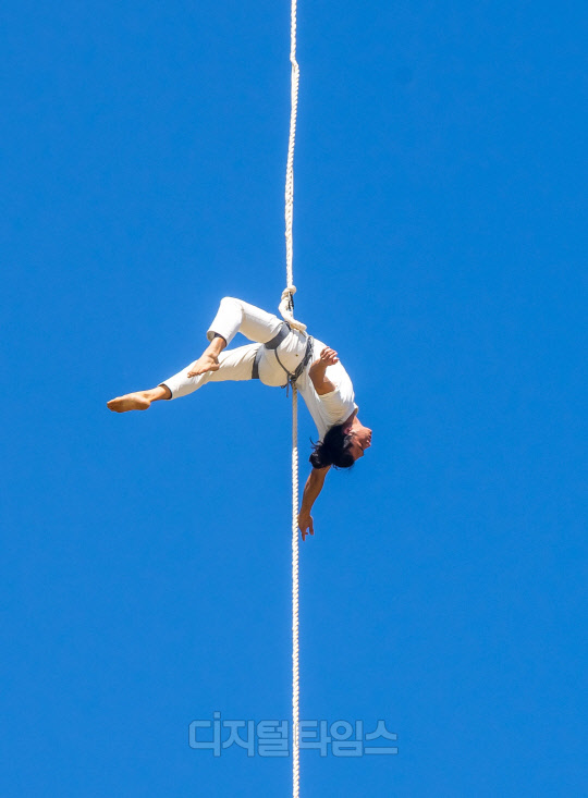8일 서울 마포구 문화비축기지에서 열린 2022 서울 서커스 페스티벌 '서커스 캬바레' 리허설에서 공연창작집단 사람의 단원이 작품명 '숨' 공연을 선보이고 있다.