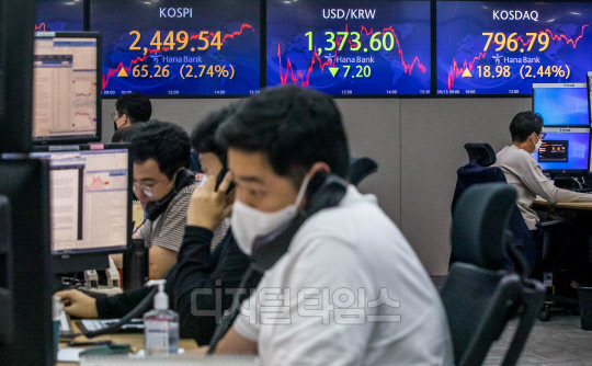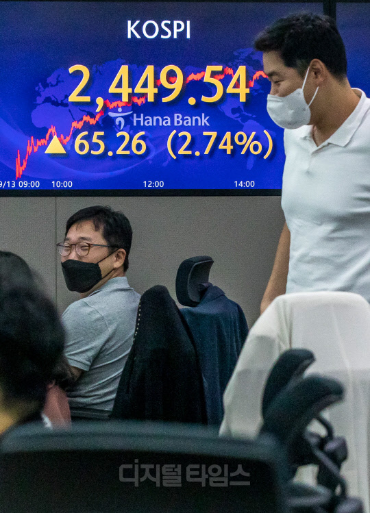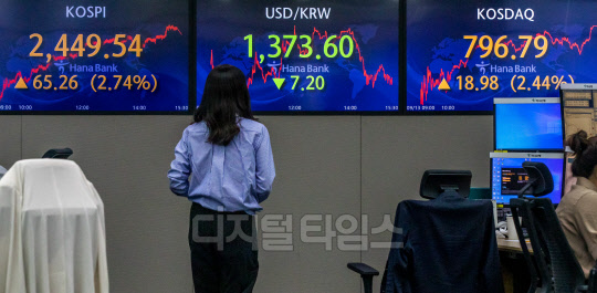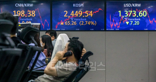 코스피가 전 거래일보다 65.26포인트 오른 2449.54로 장을 마친 13일 서울 중구 하나은행 딜링룸에서 직원들이 분주히 업무를 보고 있다. 이날 원·달러 환율은 7.2원 내린 1373.6원, 코스닥은 18.98포인트 오른 796.79로 마감했다.