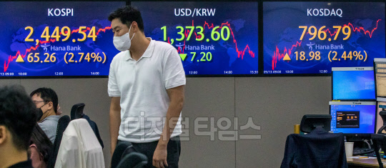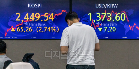 코스피가 전 거래일보다 65.26포인트 오른 2449.54로 장을 마친 13일 서울 중구 하나은행 딜링룸에서 직원들이 분주히 업무를 보고 있다. 이날 원·달러 환율은 7.2원 내린 1373.6원, 코스닥은 18.98포인트 오른 796.79로 마감했다.