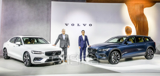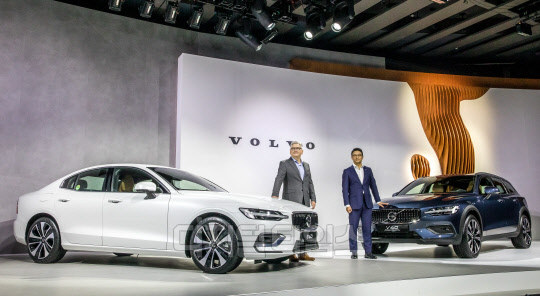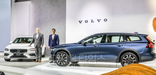 닉 코너 볼보자동차 APEC 총괄(왼쪽)과 이윤모 볼보자동차코리아 대표이사가 27일 서울 중구 웨스틴 조선 서울에서 열린 볼보자동차코리아 신형 S60 및 V60 크로스컨트리 차량 공개 행사에서 S60(흰색)과 V60 크로스컨트리 차량을 선보이고 있다.