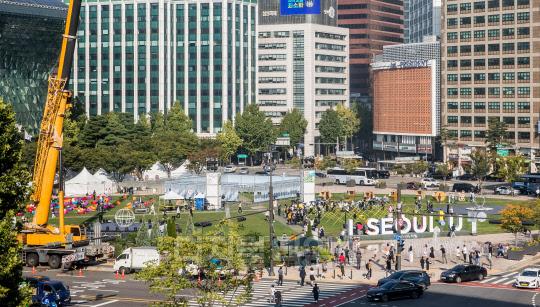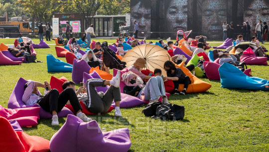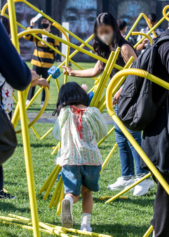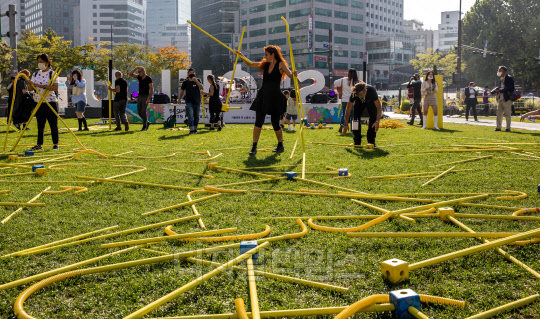 '서울거리예술축제 2022'가 개막한 30일 서울시청 광장에서 시민들이 전시를 즐기고 있다.