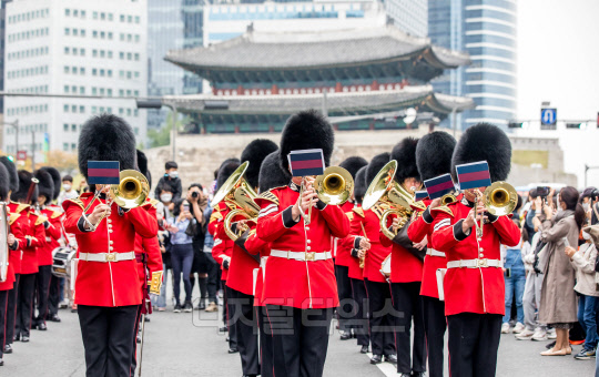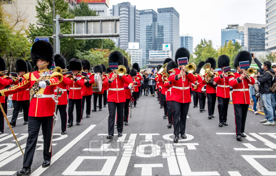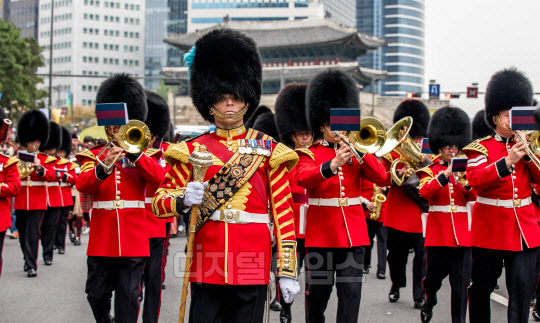 [포토] 서울 도심 퍼레이드하는 영국 왕실 근위대 군악대