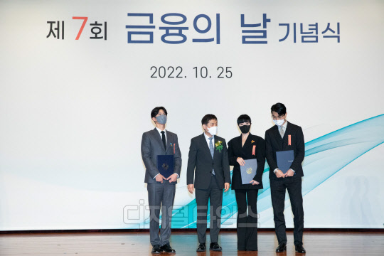 김주현 금융위원장(왼쪽 두번째)이 25일 서울 여의도 63컨벤션센터에서 열린 '제7회 금융의 날 기념식'에서 배우들에게 훈포장과 표창을 수여한 뒤 기념촬영을 하고 있다. 왼쪽부터 배우 박보검, 김 위원장, 김혜수, 차승원.