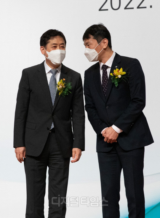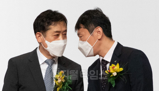 김주현 금융위원장(왼쪽)과 이복현 금융감독원장이 25일 서울 여의도 63컨벤션센터에서 열린 '제7회 금융의 날 기념식'에서 만나 이야기를 나누고 있다.