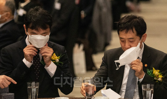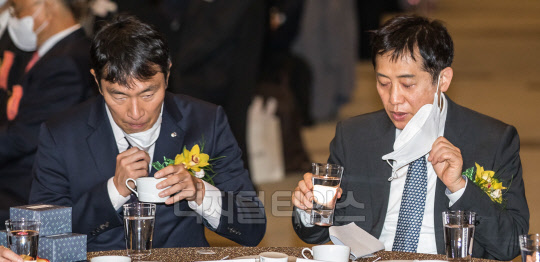 김주현 금융위원장(오른쪽)과 이복현 금융감독원장이 25일 서울 여의도 63컨벤션센터에서 열린 '제7회 금융의 날 기념식'에서 각각 물과 커피를 마시고 있다.