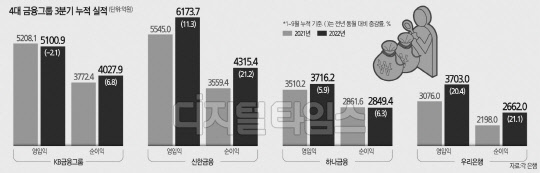 25일 금융권에 따르면 4대 금융지주(KB·신한·하나·우리)는 3분기(6월~9월) 4조8876억원의 당기순이익을 기록했다.