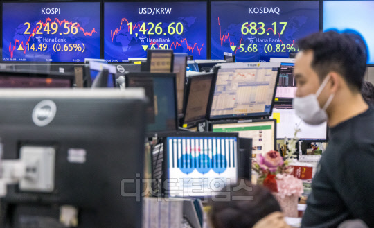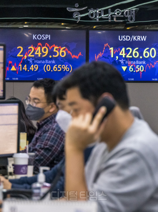코스피가 전 거래일보다 14.49포인트 오른 2249.56으로 장을 마친 26일 서울 중구 하나은행 딜링룸에서 직원들이 분주히 업무를 보고 있다. 이날 원·달러 환율은 6.5원 하락한 1426.6원, 코스닥은 5.68포인트 하락한 683.17로 마감했다.