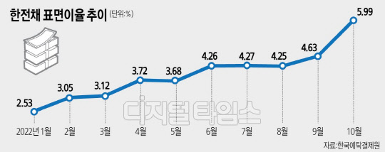 전날 한전은 2년 만기 채권 2000억원과 3년 만기 2000억원에 대한 입찰을 진행했다. 2년물은 800억원 어치를 발행해 조달을 확정했지만 3년물은 최종 유찰된 것으로 확인됐다. 발행된 2년 만기 한전채의 금리는 연 5.99%로 6%에 육박했다.