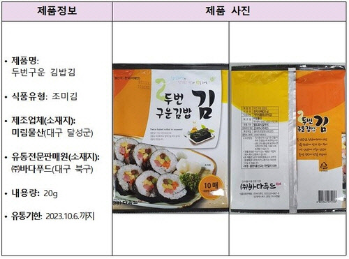 식품의약품안전처는 미림물산이 제조·판매한 '두번구운 김밥김'에서 기준치(0.3㎎/㎏ 이하)를 초과한 중금속인 카드뮴(0.4㎎/㎏)이 검출돼 해당 제품을 판매 중단하고 회수 조치한다고 1일 밝혔다.