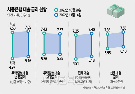 ◇"대출금리 8% 돌파 머지 않았다"= 현재 시중은행의 대출 금리는 주택담보·전세·신용대출 등 종류에 상관없이 약 13년 만에 모두 연 7%를 넘어선 상태다.지난 4일 기준 KB국민·신한·하나·우리은행의 주택담보대출(주담대) 변동금리와 고정금리는 연 5.160∼7.646%, 5.350∼7.374% 수준이다. 신용대출 금리(1등급·1년)는 연 6.100∼7.550%, 대표적 서민 대출상품인 전세자금대출(주택금융공사보증·2년 만기)도 5.180∼7.395%로 이미 7%대 중반에 이르렀다.