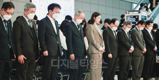 이재근 KB국민은행장(왼쪽부터), 오영교 동반성장위원장, 전 피겨선수 김연아 등 내빈들이 7일 서울 강남구 코엑스에서 열린 '2022 제2차 KB굿잡 우수기업 취업박람회' 개막식에서 이태원 참사 애도 묵념을 하고 있다.