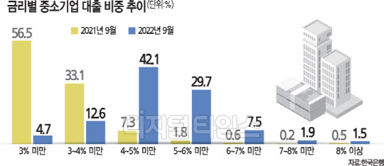 이들 중소기업 가운데 상당수는 이미 5% 이상의 고금리 부담을 떠안고 있다. 한은에 따르면 5% 이상 대출 이자를 부담하고 있는 중소기업의 비중은 1년 전에는 전체의 3% 수준이었는데, 올 9월에는 40.6%로 늘었다.