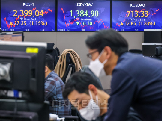 [포토] 2400선 앞둔 코스피, 1400원 무너진 환율