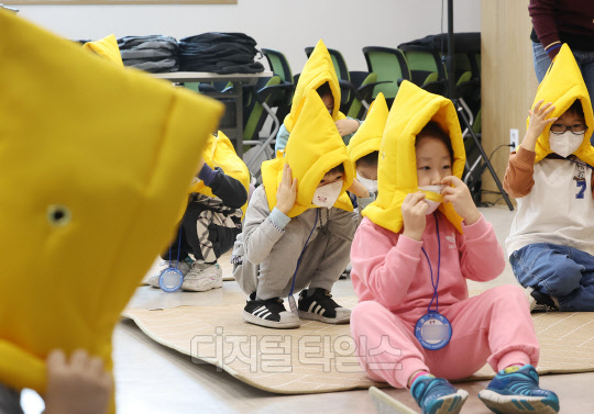 10일 서울 마포구 희망브리지 전국재해구호협회에서 열린 '2022 쉐이크아웃(ShakeOut) 코리아' 지진대응훈련에서 유치원 원생들이 지진 대피 훈련을 하고 있다.