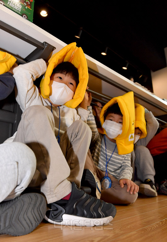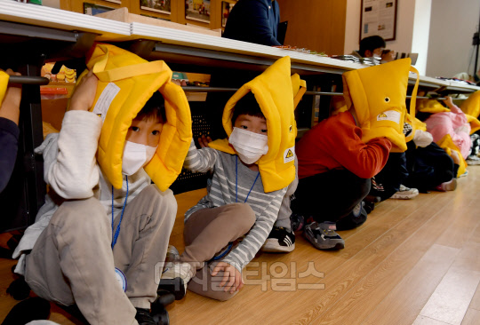 10일 서울 마포구 희망브릿지 전국재해구호협회에서 열린 지진대비훈현 '2022 쉐이크아웃 코리아'에 참석한 어린이들이 안전모자를 쓴채 훈련에 임하고 있다.