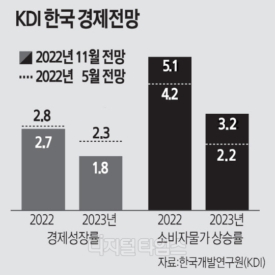 KDI는 치솟는 물가에 따른 기준금리 인상 필요성을 인정했다. 내년에도 물가 상승률은 안정 목표치(2%)를 상회하는 3.2%에 이르면서, 기준금리를 점진적으로 올려야 한다는 설명이다. 다만 향후 경기둔화가 우려되는 점을 고려해 긴축의 속도·강도를 조절해야 한다고 지적했다. 특히 민간부채가 높은 와중에 이뤄진 금리 인상은 경기에 적잖은 하방요인이 될 수 있다는 관측이다. 정규철 KDI 경제전망실장은 "(한국은행이) 여러 차례 금리를 0.5%포인트 올렸는데,이런 추세가 지속되면 경기에 상당한 부담이 될 것"이라고 설명했다.