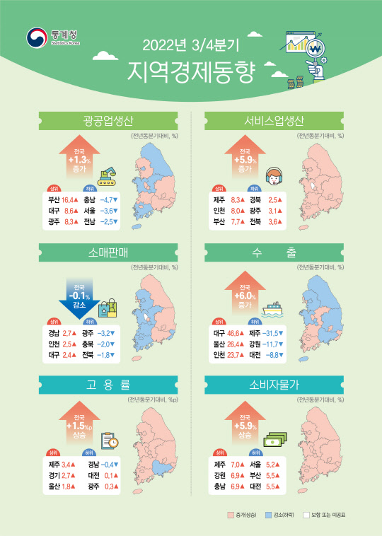 건설수주는 토지조성, 사무실·점포, 주택 수주가 늘어난 세종(293.7%), 강원(272.5%), 부산(217.3%)을 중심으로 29.4% 증가했다. 전국 고용률 평균은 62.8%였다. 경남(-0.4%포인트)은 하락했고, 제주(3.4%포인트), 경기(2.7%포인트), 울산(1.8%포인트)은 상승했다.