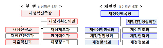 기재부는 '기획재정부와 그 소속기관 직제 시행규칙 일부 개정령안'을 입법 예고한다고 21일 밝혔다. 개정안에 따르면 재정정책의 총괄적인 수립과 관리를 위해 재정혁신국을 재정정책국으로 개편한다. 재정기획심의관을 재정건전성심의관으로 바꿔 재정건전성 지표의 목표를 설정하고, 관리 기능을 전담시킬 계획이다. 참여예산과는 국내 주요기관, 국제기구, 해외 주요국 등과 재정협력 기능을 총괄하는 재정협력과로 개편키로 했다.