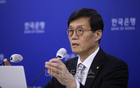이창용 한국은행 총재가 24일 서울 중구 한국은행에서 열린 금융통화위원회 본회의를 마친 뒤 기자간담회를 하고 있다.