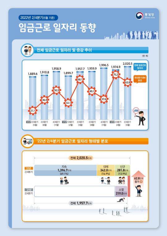 24일 통계청이 발표한 '2022년 2분기 임금근로 일자리 동향'에 따르면 올해 2분기(5월 기준) 임금근로 일자리 수는 2020만5000개로 1년 전보다 62만8000개 증가했다. 전년 대비 증가 폭은 1분기(75만2000개)에 비해 다소 줄어들었다. 작년 동기부터 같은 근로자가 점유한 일자리는 1296만7000개(69.1%)였다. 퇴직·이직으로 근로자가 바뀐 일자리는 342만개(16.9%)였다. 기업체 생성이나 사업확장에 의한 신규 일자리는 281만8000개(13.9%), 기업체 소멸이나 사업축소로 사라진 일자리는 219만개로 각각 집계됐다.