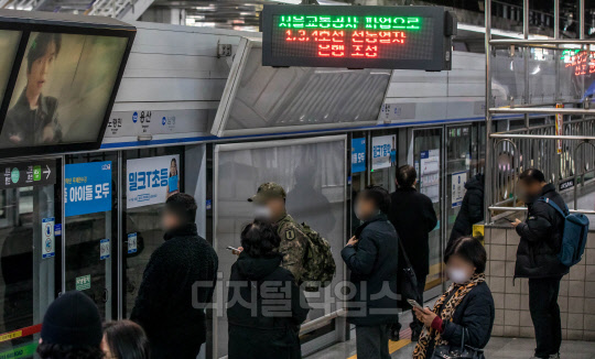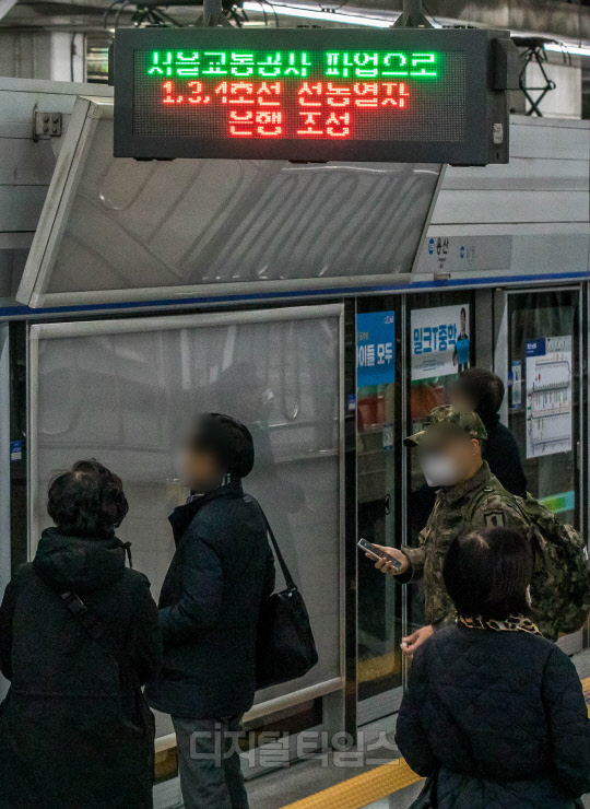서울 지하철을 운영하는 서울교통공사 노동조합이 파업에 돌입한 30일 서울 지하철 1호선 용산역 승강장에서 파업 관련 안내가 나오고 있다.