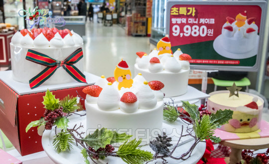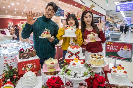 30일 서울 용산구 이마트 용산점 블랑제리 매장에서 열린 신세계푸드 9980원 '갓성비' 크리스마스 케이크 출시 행사에서 모델들이 케이크를 선보이고 있다.