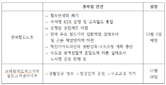 철도노조는 "지난 11월 5일 철도공사 오봉역에서 입환업무를 하던 철도노동자는 끝내 퇴근하지 못했다. 올해만 벌써 4번째 죽음"이라며 "인력충원과 이동통로 등 작업조건 개선을 줄곧 요구했지만 정부와 공사는 예산 부족을 이유로 번번이 거절했다"고 밝혔다. 한 노조 관계자는 "철도민영화 정책 철회, 수서행 KTX 운행 및 고속철도 통합, 공정한 승진제도 마련을 요구했지만 정부는 1000여명이 넘는 인력의 축소를 검토하고 있다"고 강조했다.