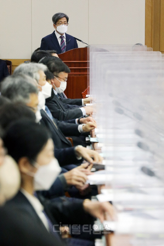 김명수 대법원장이 2일 오후 서울 서초구 대법원에서 열린 전국법원장회의에서 인사말 하고 있다.