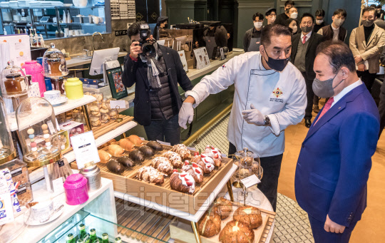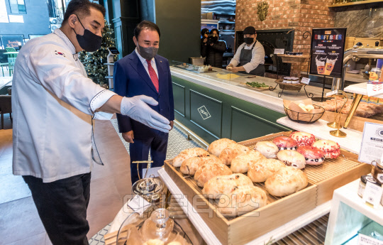 윤홍근 제너시스BBQ 회장이 6일 서울 송파구 'BBQ 빌리지(BBQ Village)' 송리단길점에서 열린 오픈행사에 참석해 관계자 설명을 들으며 매장을 살펴보고 있다. BBQ 빌리지 송리단길점은 치킨 외 브런치, 베이커리, 커피, 화덕피자 등 약 190여종의 메뉴를 도입한 약 160평, 220석 규모의 첫 프리미엄 플래그십 '크로스오버' 매장이다.