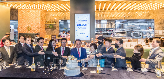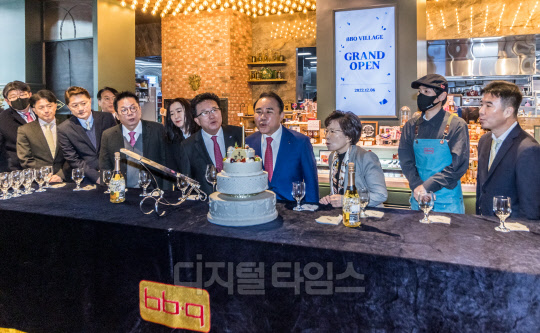 윤홍근 제너시스BBQ 회장, 윤경주 부회장 겸 대표이사, 김태천 부회장 등 내빈들이 6일 서울 송파구 'BBQ 빌리지(BBQ Village)' 송리단길점에서 열린 오픈행사에 축하 케이크를 자르고 있다. BBQ 빌리지 송리단길점은 치킨 외 브런치, 베이커리, 커피, 화덕피자 등 약 190여종의 메뉴를 도입한 약 160평, 220석 규모의 첫 프리미엄 플래그십 '크로스오버' 매장이다.