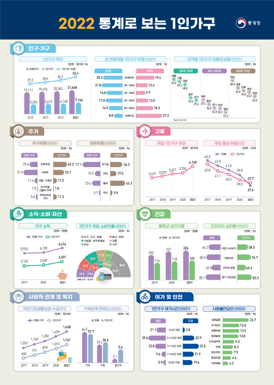작년 10월 기준 취업상태인 1인가구는 전년 대비 44만가구 증가한 414만가구였다. 직업별 비중은 전문가·관련 종사자(23.4%), 단순노무종사자 (16.2%), 사무종사자(16.2%) 순이었다. 이들의 연간 소득은 전체 가구(6414만원)의 42.0%인 2691만원에 그쳤다. 올해 1인 가구의 자산은 2억1108만원, 부채는 3583만원으로 각각 집계됐다. 자산은 전체 가구(5억4772만원)의 38.5% 수준이었다.