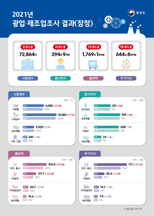 생산액에서 주요 중간투입 비용을 뺀 광업·제조업의 부가가치(644조8000억원)도 1년 전보다 15.8%(88조원) 늘어 2010년(16.1%) 이후 가장 높은 증가율을 보였다. 전자·통신 제조업은 출하액이 313조원, 부가가치가 171조1000억원으로 각각 50조5000억원(19.2%), 32조7000억원(23.7%) 증가했다.