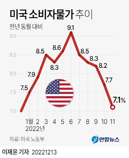 13일(현지시간) 미국 노동부에 따르면 지난달 CPI 상승률은 전년 동월 대비 7.1%를 기록했다. 이는 지난 10월(7.7%)보다 크게 둔화된 수치다.