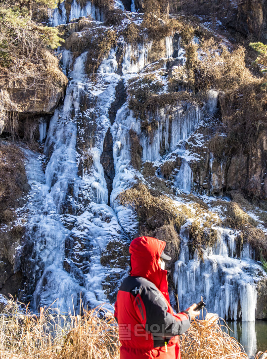 수도권 지역 등에 한파특보가 발효된 18일 서울 서대문구 홍제천 인공폭포가 얼어있다.
