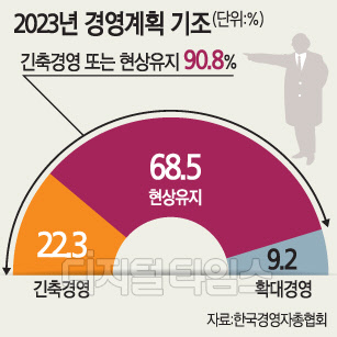 경영계획을 수립한 기업들의 90.8%는 내년 기조에 대해 현상유지(68.5%)를 하거나 긴축경영(22.3%)을 하겠다고 했다. 확대경영을 계획한 기업은 9.2%에 불과했다.
