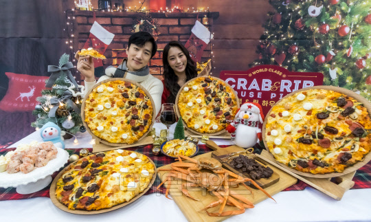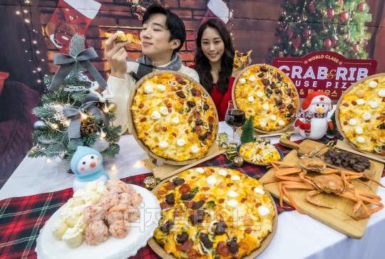 19일 서울 중구 도미노피자 명동점에서 모델들이 피자 한 판에 두 가지 맛을 즐길 수 있는 하프앤하프 '크랩&립 하우스' 피자를 소개하고 있다. 이번 신제품은 스노우 크랩과 스노우 치즈로 눈꽃 축제를, 립 스테이크를 통해서는 불꽃 축제를 형상화한 제품이다.