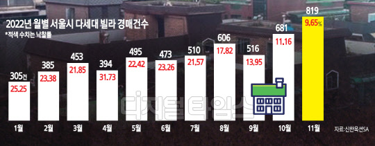 주택 시장도 사정은 다르지 않다. 지난해 말부터 하락기가 시작된 주택시장 역시 처음에는 금리 상승에 따른 대출 이자 부담을 견디지 못하고 집주인들이 급매물을 내놓기 시작했다. 급매물 마저 팔리지 않고 쌓이면서 경매 건수가 늘어났다. 올해 11월 기준 서울 주택 경매건수는 1월 대비 두배 이상 늘었다.