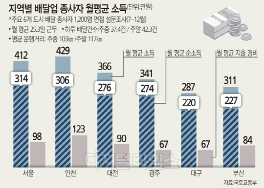 주요 6개 도시 배달 종사자 1200명을 대상으로 실시한 면접 설문조사 결과 월 평균 약 25.3일을 일하며 약 381만원을 벌었지만 약 95만원을 보험료, 렌탈료 등으로 지출했다. 하루 평균 배달건수는 주중 37.4건·주말 42.3건, 평균 운행거리는 주중 103km·주말 117km으로 나타났다.