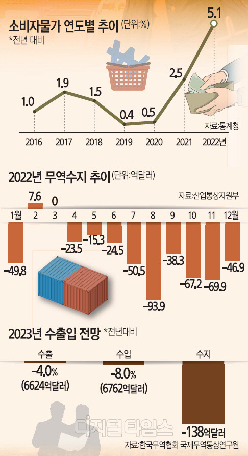 올해 경제는 작년보다 더 어려울 전망이다. 경제협력개발기구(OECD), IMF는 물론 정부까지도 올해 우리나라 경제 성장률이 1%대에 그칠 것으로 보고 있다. 가장 큰 걱정거리는 부진한 수출이다. 수출은 이미 지난달까지 석 달 연속 줄어들었고, 주력 품목인 반도체 수출이 크게 흔들렸다. 지난달 물가도 여전히 높은 5%에 머무르며 소비를 위축시켰다. 수출 감소와 고물가는 기업 생산을 줄게 만드는 주된 요인이다.