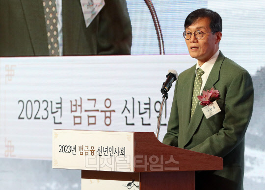 이창용 한국은행 총재가 3일 서울 중구 롯데호텔에서 열린 2023년 범금융 신년인사회에서 신년사를 하고 있다.