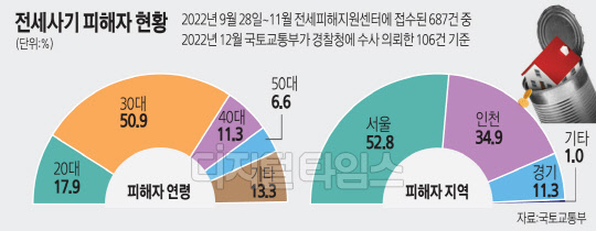 국토교통부에 따르면 국토부가 경찰청에 수사 의뢰한 전세사기 사건 106건의 피해자 중 30대가 50.9%, 20대가 17.9%를 차지했다. 피해자의 68.8%가 2030세대인 셈이다.