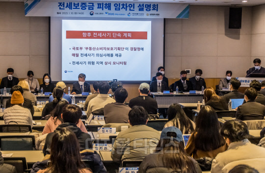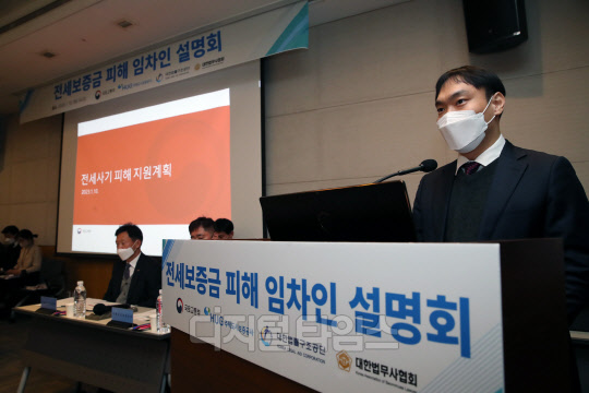 정덕기 국토교통부 임대차지원팀 과장이 10일 서울 여의도 전경련회관에서 열린 전세보증금 피해 임차인 설명회에서 전세사기 피해 지원계획에 대해 발표하고 있다.