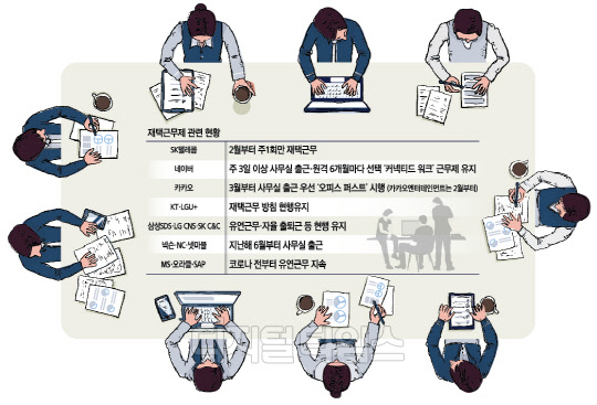 네이버는 직원들이 6개월마다 전면 재택근무나 주 3일 이상 사무실 출근 중 선택할 수 있게 하고 있다. 재택근무와 사무실 출근을 직원 자율에 맡긴 '커넥티드 워크'의 일환이다. 삼성SDS와 LG CNS, SK C&C는 유연근무·자율출퇴근 등 현행 체계를 유지한다. CJ올리브네트웍스는 주 2회 재택근무를 이어갈 예정이다. 직원들의 업무 몰입도를 높이기 위해 작년 11월 경기 분당에 거점오피스를 열기도 했다. MS(마이크로소프트), 오라클, SAP, 델 등 글로벌 IT 기업들은 코로나 이전부터 유연근무를 이어왔다. MS의 경우 코로나 이전에는 사무실 출근이 중심, 코로나 상황에는 재택근무가 중심이었을 뿐 유연한 근무체계를 운영했다. 현재는 출근과 재택근무를 절반씩 하는 하이브리드 근무체계다. 델은 생산시설, 물류시설 등 특정 장소에서만 근무할 수 있는 직원을 제외하고는 원격근무를 하고 있다. 다만 사무실 출근을 전면 금지하던 것에서 필요시 허용하는 것으로 바꿨다. 오라클은 고객지원, 영업 등은 외근을 기본으로 하고 대부분은 부서장 판단에 따라 출근과 재택을 병행하고 있다.