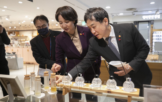 이영 중소벤처기업부 장관과 김주현 금융위원장이 11일 서울 양천구 중소기업유통센터를 방문해 중소기업 제품 판매 매장을 둘러보고 있다.