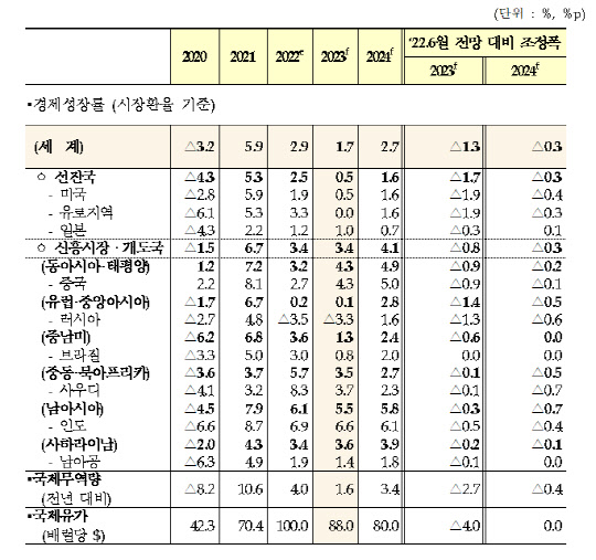 중국은 성장률이 꺾였지만, 올해 4.3% 성장한다고 봤다. 중국보다 성장률이 높게 예상된 국가는 인도(6.6%) 정도다. 코로나19 봉쇄조치가 완화돼 경제가 반등할 수 있다는 관측이다. 다만 코로나19 확산 등을 고려해 직전 전망치보다는 0.9%포인트 낮췄다.